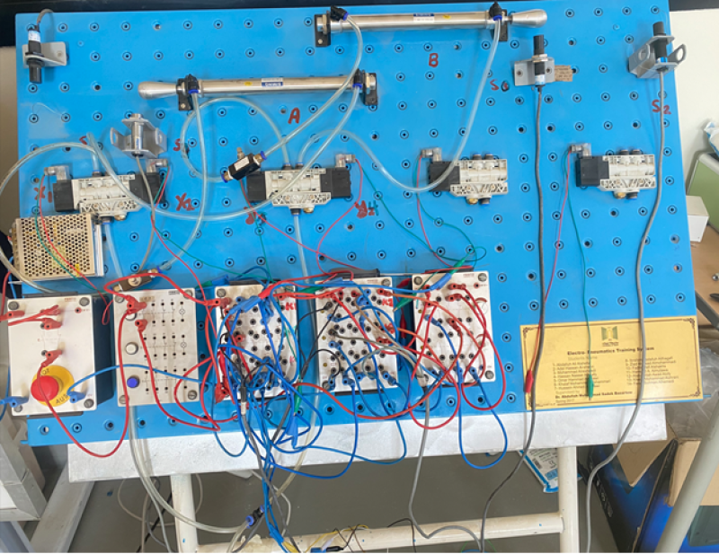 A group of mechanical engineering students at the University of Tabuk,, designed and implemented an integrated electro-pneumatic control panel as a mini project. This project was developed due to the current lack of a laboratory for the Hydraulics and Pneumatics course, as well as the importance of this field within the mechanical engineering discipline and the students’ need for hands-on practical application. The system controls the motion of two pneumatic cylinders using a set of electro-pneumatic valves and various proximity sensors (inductive, capacitive, and photoelectric sensors), which are connected to an electrical control circuit based on relay logic, as illustrated in the figure. |