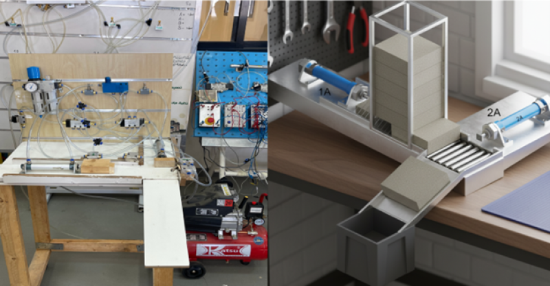Design and Implementation of a Pneumatic-Control Transfer System | Dr. Abdullah Mohammad Sadek Bazartow | A group of mechanical engineering students at the University of Tabuk, , designed and implemented a pneumatic-based material handling device as a training project (Mini Project). This project was developed due to the current unavailability of a laboratory for the Hydraulics and Pneumatics course, as well as the importance of this field within the mechanical engineering discipline and the students’ need for hands-on practical training. The system controls the motion of two pneumatic cylinders using a set of various pneumatic valves and air sensors, along with an air compressor and a compressed air treatment unit, all interconnected through a compressed air circuit, as illustrated in the figure. The first cylinder pushes the product from a storage bin toward the path of the second cylinder and then retracts. Subsequently, the second cylinder pushes the product forward onto a chute that leads to a product collection bin, after which it retracts again in preparation for the continuous repetition of the operating cycle. |