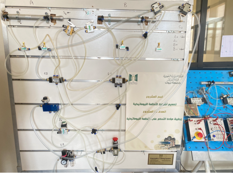 A group of mechanical engineering students at the University of Tabuk, , designed and implemented an integrated pneumatic control panel as a training project (Mini Project). This project was developed due to the current unavailability of a laboratory for the Hydraulics and Pneumatics course, as well as the importance of this field within the mechanical engineering discipline and the students’ need for hands-on practical practice. The system controls the motion of two pneumatic cylinders through a set of various pneumatic valves and sensors, along with an air compressor and a compressed air preparation (air treatment) unit, all interconnected through a compressed air circuit, as illustrated in the figure. |